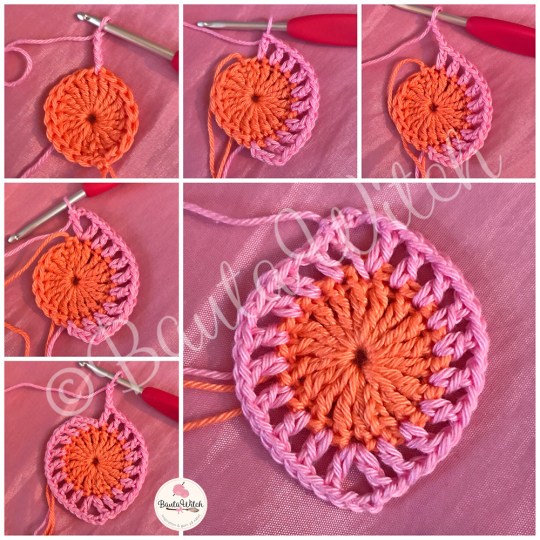 Här har jag alltid fortsatt med samma färg när jag virkat varv 5.