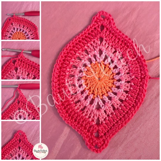 Varv 4: Börja i valfri m utmed någon av rutans kanter, med 1 st (= 3 lm) och virka så 1 st i varje m med undantag för ”spetsarna” på din ruta. Runt lmb som bildar din ”spets” virks 2 st, 3 lm, 2 st. Varvet avslutas med 1 sm i den 3:e lm på din första st.