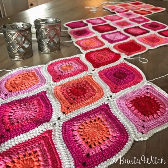 Från början hade jag tänkt att virka en pläd av dem men när jag lade ut dem på mitt arbetsbord (dvs vårt köksbord som ständigt är belamrat med garner och mina pågående projekt) i olika formationer kände jag att jag nog gärna har dem just på bordet, i en mer orientalisk form, som en löpare.