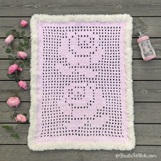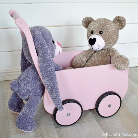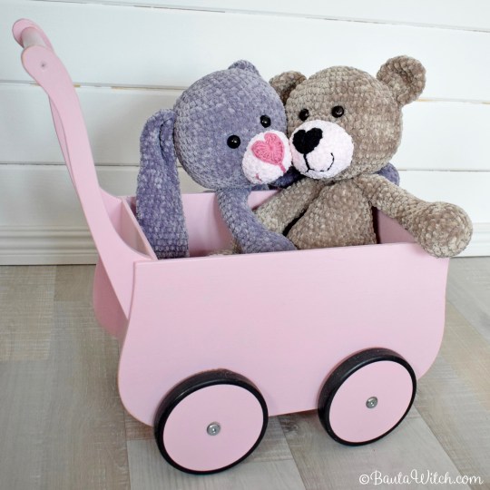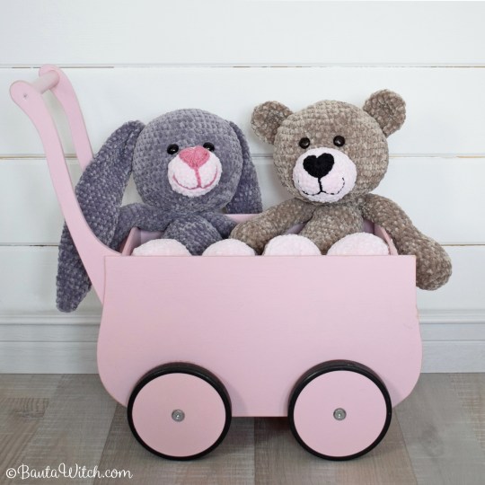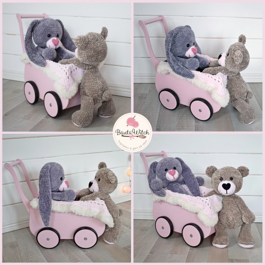 Om du undrar över den rosa och mjuka pläden jag bäddat med i den söta trävagnen, så är även den mitt mönster: Babypläd i filetvirkning med rosor. Den är virkad i samma sammetsgarn som gosedjuren och är kantad med vårt lyxiga pälsgarn, Alpine. Vagnen kommer från Kalikå och den köpte jag begagnad på Blocket för 200 kr. Ett riktigt fynd!
