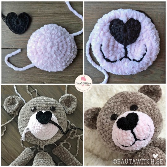 Tur att jag skrev ner varv för varv hur jag gjorde för annars hade min nalle aldrig haft 2 lika stora öron eller 2 lika långa armar… Benen var nog den största utmaningen. Att få till fötterna så att han kunde stå på dem. Jag virkade 5 stycken ben innan jag nöjde mig!