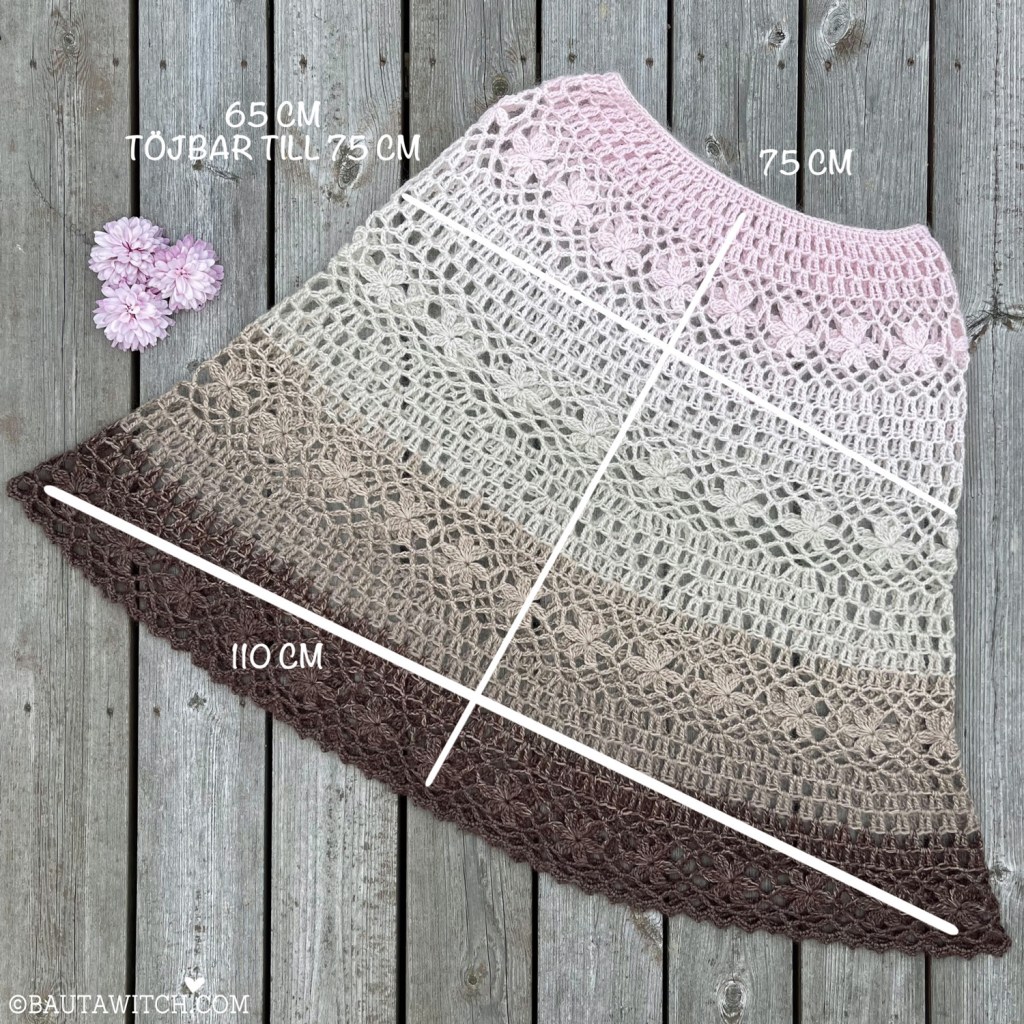 Vill du göra din poncho ännu större så går det bra. Du börjar då med dina ökningar redan efter första raden blommor så att din poncho får mer vidd tidigare. Jag har inte testvirkat detta så därför är det svårt att veta hur mycket garn som går åt. Jag skulle åtminstone köpa till ett nystan Diva i lämplig färg