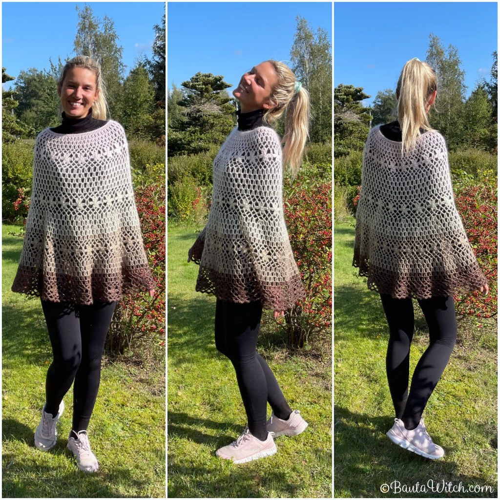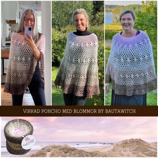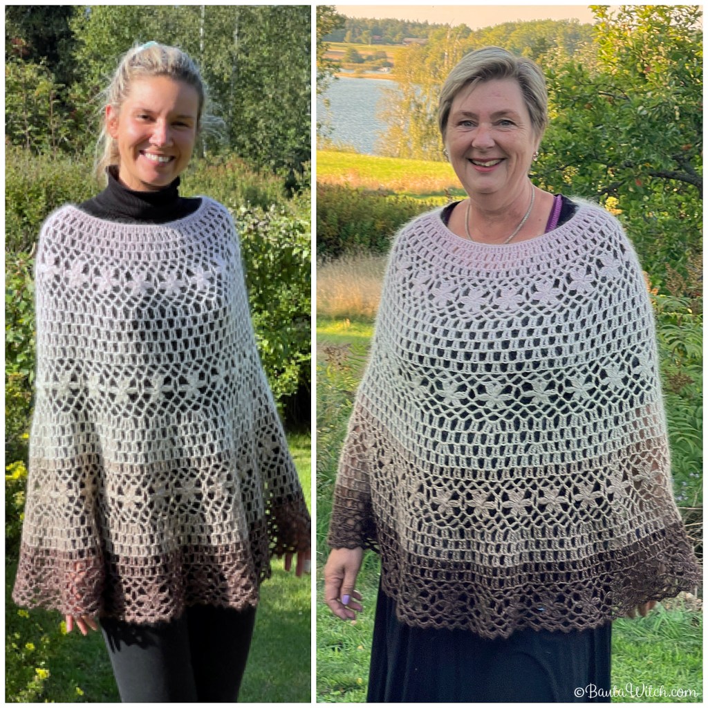 Ponchon är one size och passar ändå upp till storlek 46/48 och kupa 85C. På bilderna här i mönstret ser du min poncho på mig (storlek 36/38 och 1.68 lång), på min äldsta dotter Nikolina som är lång och smal (34/36 och 1.78 lång) samt på min goa väninna Julia (46/48 och 1.73).