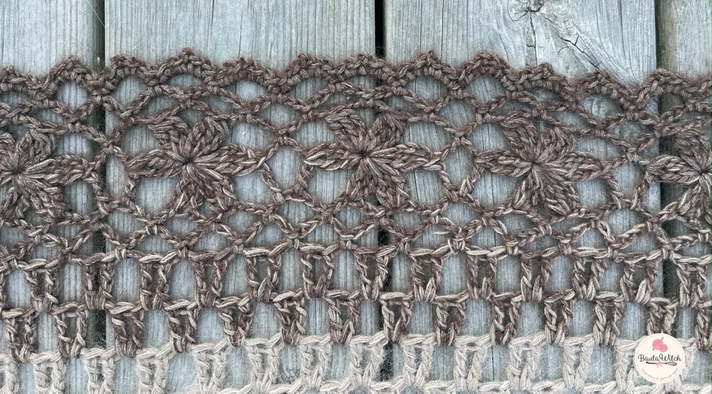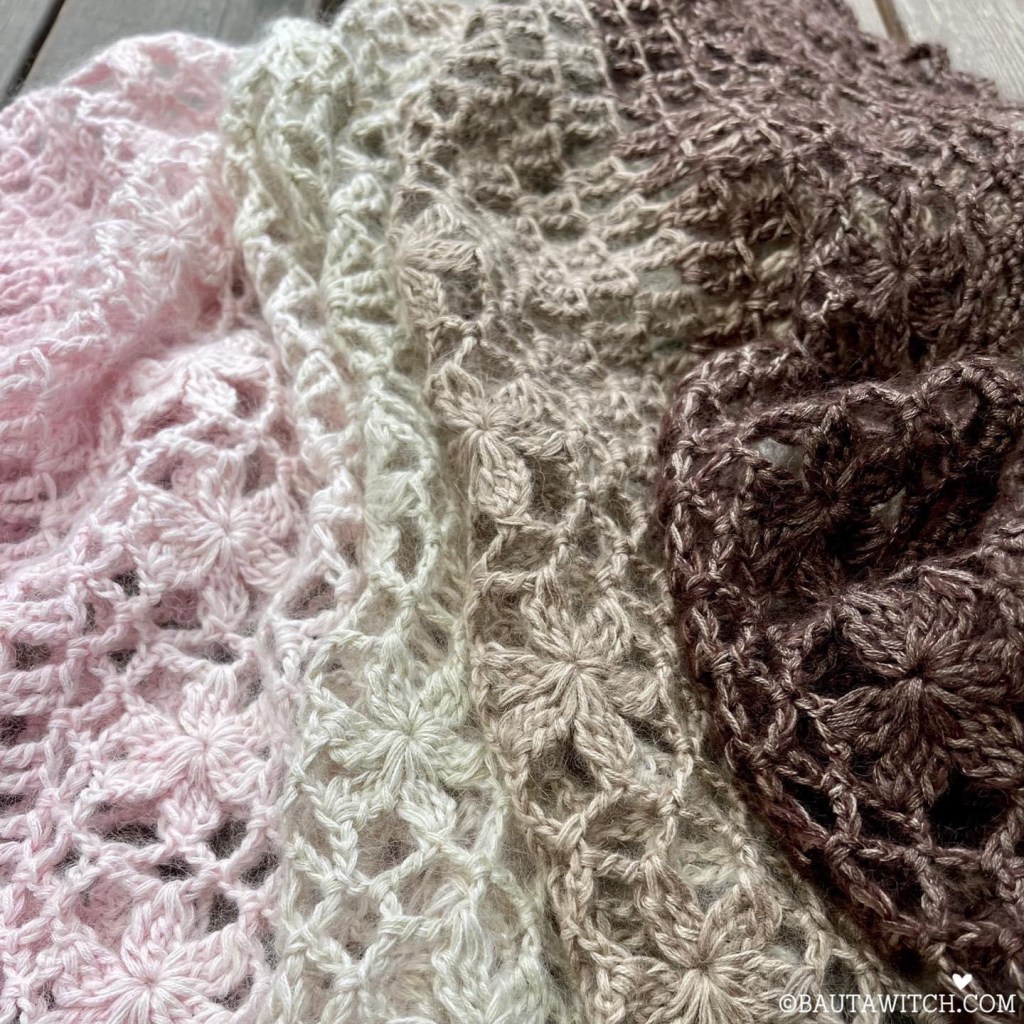 Jag har virkat med Lola och Diva: Lola YarnCake BautaWitch Special Collection (200 gr) som ingår i min egen färgsatta serie, (”Sanddyner” heter nystanet och går från babyrosa via flera beige nyanser till brunt) samt en matchande Lola Solo (50 gr) i denim brunt. Diva i naturvitt (2x 25 gr), Diva beige (25 gr) och Diva brun (25 gr). Denna färgställning finns som garnkit i webbshoppen.