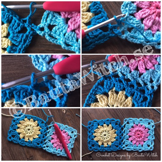 Varv 4: Börja i valfri m utmed någon av rutans kanter, med 1 st (= 3 lm) och virka så 1 st i varje m med undantag för ”spetsarna” på din ruta. Runt lmb som bildar din ”spets” virks 2 st, 3 lm, 2 st. Varvet avslutas med 1 sm i den 3:e lm på din första st.