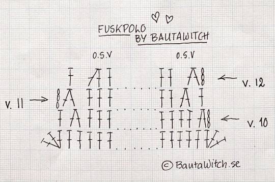 v 25. 1 fm i de första 7 m, 2 fm i nästa m, (1 fm) x11, 2 fm i nästa m, (1 fm) x11, 2 fm i nästa m, (1 fm) x7 = 42 fm