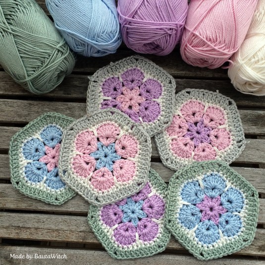 I made African flowers the other week? Then I had no idea what to make of them… I just wanted to crochet with wonderful pastels in my favorite yarn Catania and dream of spring! (Catania is a 100% cotton yarn and you use a 3 or 3,5 mm hook with it.)