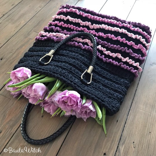 Min nya väska är virkad i en helt ny teknik som jag experimenterade fram med en vävd trasmatta i mina tankar. Effekten får du fram genom att använda 2 olika garner med olika grovlek. Jag har virkat i Ribbon XL och Catania och den blir så pass tät att den inte behöver fodras! Dessutom blir insidan riktigt snygg, så den behöver du inte skämmas över! 🙂