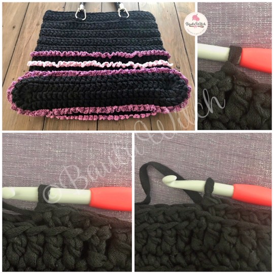 1. Du tar din väskbotten (min är 25×14 men 32×10 fungerar precis lika bra!) och virkar fm med Ribbon (använd garnet från ytteränden så tvinnar sig garnet mindre) istället för att laska runt den. I hörnhålen virkar du 1 fm, 1 lm 1 fm. För att få virknålen genom hålet använde jag strlk 4 även till Ribbon. Avsluta varvet med 1 sm. Virka så en lm med ett av dina Catania-nystan.