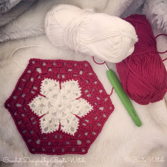 Jag ville först göra en kvadratisk ruta men då stjärnan har 6 uddar måste man då först få den till en cirkel och sedan få till de 4 hörnen. Hur jag än gjorde blev resultatet klumpigt och fult. Så ”det bidde ingen kvadrat utan en ”hexagon”, dvs en ruta med 6 hörn. På något vis känns en hexagon litet mer elegant, tycker ni inte!? 😉 Det finns ju ändå redan så många kvadratiska mormorsrutor…