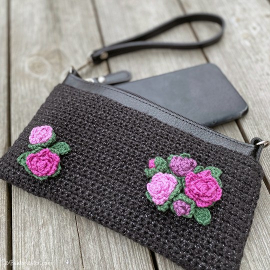 Ovandelen virkar eller syr du fast. Till just denna mobilväska syr vi fast den. (Om du vill virka fler väskor och då virka fast ovandelen så börjar du upptill med fm i hålen och virkar istället väskan nedåt.)