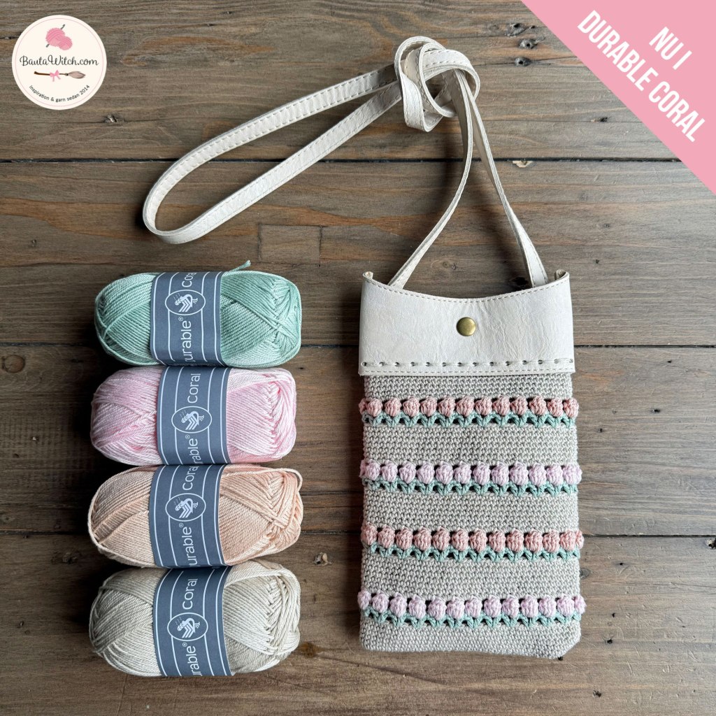 Det finns ett komplett materialkit i min webbshop som innehåller crémefärgad ovandel med väskrem samt 4 nystan Durable Coral i färgerna ovan. Det går även bra att byta färger i detta. Både på ovandelen och garnet. Skriv bara en kommentar när du kommer till kassan om byte och till vad.