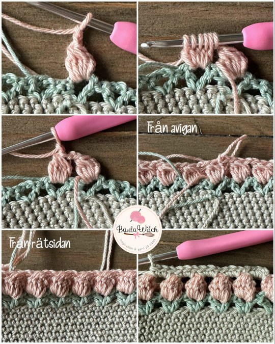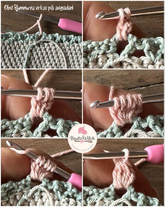 Varv 10 virkas med de babyrosa garnet från avigan runt de 2 lm i V:na. Man virkar moucher från avigan då de putar ut mer och blir mer lika tulpanblommor på sin baksida, som då hamnar på vår framsida. 🙃🙂
