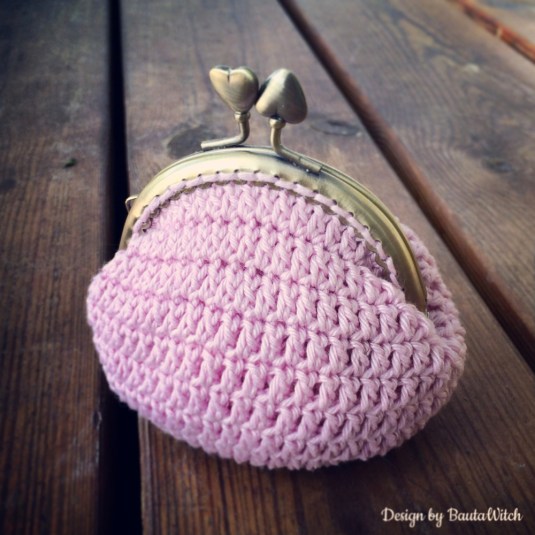 Jag tyckte att min virkade rosa vårväska med rosett behövde en matchande virkad liten bullig portmonnä! Den blev underbart söt! Själva knäppet med de ljuvliga hjärtanen blev verkligen pricken över i! ❤