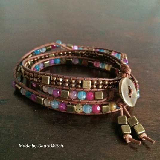 Min senaste idé var att göra ett armband i två helt olika stilar, men som ända passar ihop. För att få en effekt av att det är flera olika armband fast det bara är ett. Jag är svag för det litet ruffa antika looken som lädersnodden och kopparpärlorna får stå för i kontrast till de gulligare pastellfärgade agaterna.