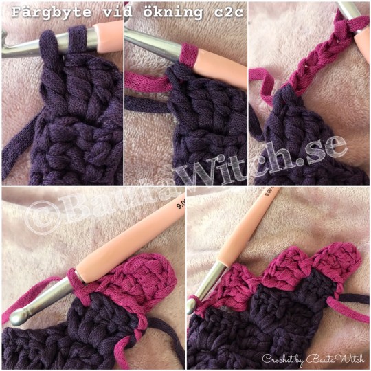 Vid första försöket använde jag Linen 2212 och istället för 4 fm mellan lmb (som det nu är i mönstret) gjorde jag 3 fm. Jag tog med de förklarande bilderna här i alla fall så ni ser hur det är gjort, även om antalet m är fel. Jag valde sedan bort Linen 2212 som färg i toppen då jag inte tyckte att de övriga färgerna kom till sin fulla rätt tillsammans med den. De ”poppar” mycket bättre ihop med kritvitt!