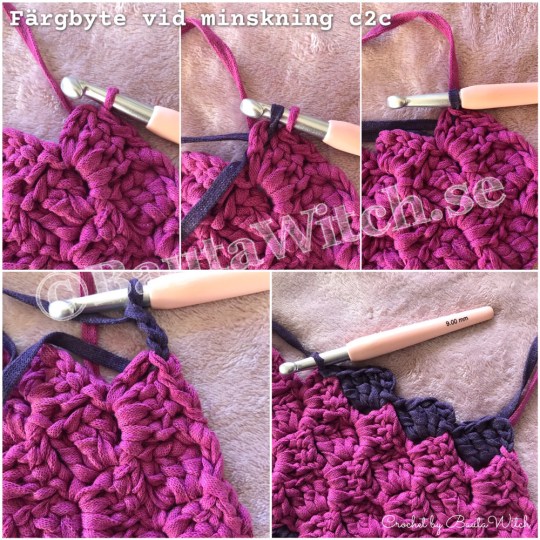 Dags att prova! Jag tyckte min topp kändes litet vid så jag gjorde några minskningar på nästa v. Minskning = virka ihop 2 st.