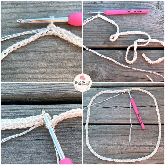 För att halsringningen ska få en snygg kant utan att man i efterhand ska behöva virka en liten uddkant eller fm runt den, ska vi använda ett litet knep: Vänd på din lm-kedja så den hamnar med baksidan mot dig.