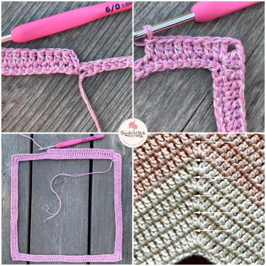 Bakstycket: 2 st i första hörnet. Hoppa över 1 st o virka sedan 1 st i varje m tills du kommer till nästa hörn, 2 st = 92 st