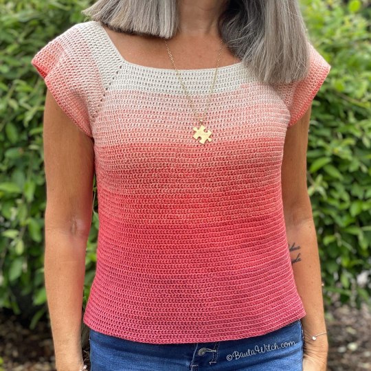 Detta innebär att storleksmässigt blir tröjan någon cm smalare än den tidigare sommartoppen då virkfastheten med våra YarnCakes är 21 st x 15 v. Du kommer även virka något färre varv raglan när du gör toppen i Durable Coral.