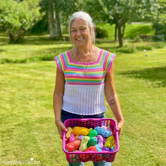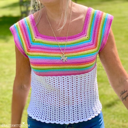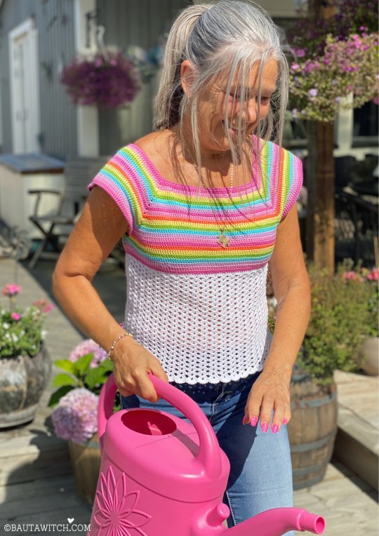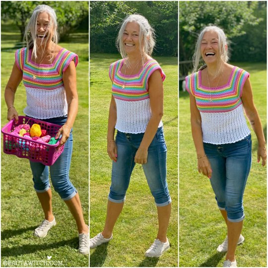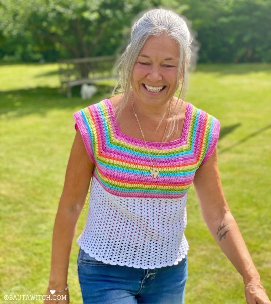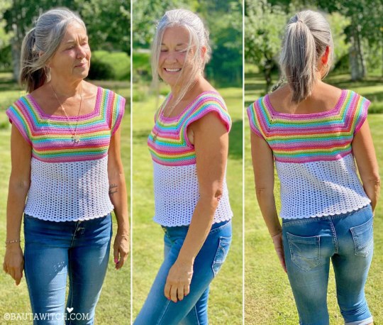 Det jag personligen gillar med mönstret på den tidigare sommartoppen, är att det är det enklaste tänkbara. Perfekt även för dig som är nybörjare. Och när ett mönster är enkelt, är det dessutom lätt att spinna vidare på och utveckla.