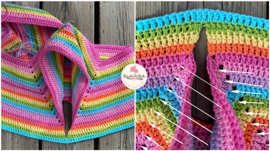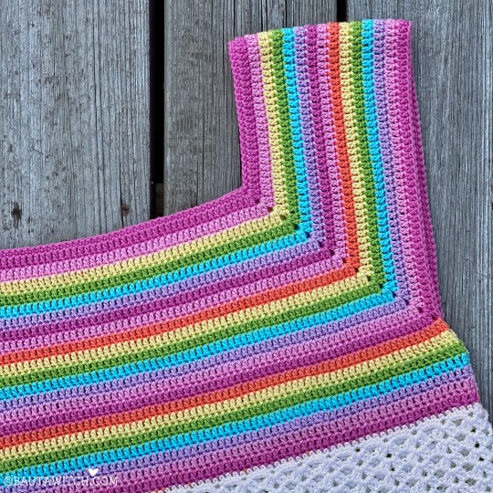 Med det antal maskor du nu har, fortsätter du att virka färgglada varv tills du täckt dina bröst. Det är lagom att sluta där bågen på din bh slutar.