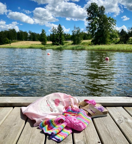 På en av båtbryggorna i vårt område, virkade jag så de första maskorna på denna lilla färgglada sak, min randiga topp. Den här varianten är inte fullt lika lätt att virka så är du nybörjare rekommenderar jag ”ursprungsmodellen”, som du hittar här!