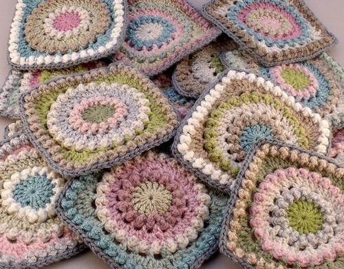 Jag har som vanligt virkat i bomullsgarnet Catania. Tanken med min design är att man till själva sippan använder sina restgarner av Catania i alla färger som man tycker om, medan övriga färger i rutorna är noga utvalda för att göra dem olika men ändå enhetliga för ett välkomponerat slutresultat.