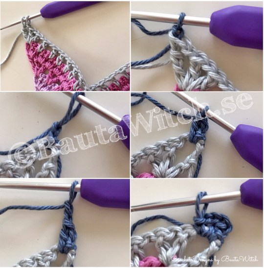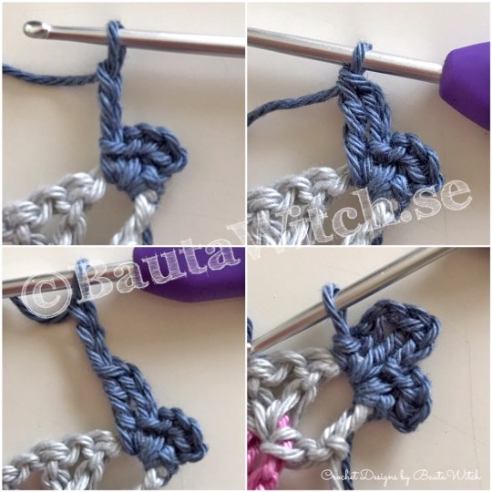 Varv 3: 4 lm (= 1 st o 1 lm), 1 st mellan tidigare varvs första o andra st, 1 lm, hoppa över 1 m, 1 st, 1 lm och ytterligare 1 st i samma m (=en ökning), 1 lm, hoppa över 1 m, 1 st, 1 lm och ytterligare 1 st i samma m (=en ökning), *1 lm, hoppa över 1 m, 1 st*. Upprepa mellan *:orna tills du har 13 ”ensamna” st. 1 lm, hoppa över 1 m, 1 st, 1 lm, och ytterligare 1 st i samma m (=en ökning), 1 lm, hoppa över 1 m, 1 st, 1 lm och ytterligare 1 st i samma m (=en ökning), 1 lm, hoppa över 1 m, 1 st, 1 lm och avsluta v med ytterligare 1 st i samma m (=en ökning).