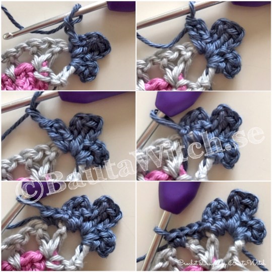 *I första lmb: virkas 1 sm, 2 lm, 1 st, 2 lm, 1fm (= första klöverbladet), 3 lm, 1 dst, 3 lm, 1 fm (= mittersta klöverbladet), 2 lm, 1 st, 2 lm, 1 sm (= tredje klöverbladet).