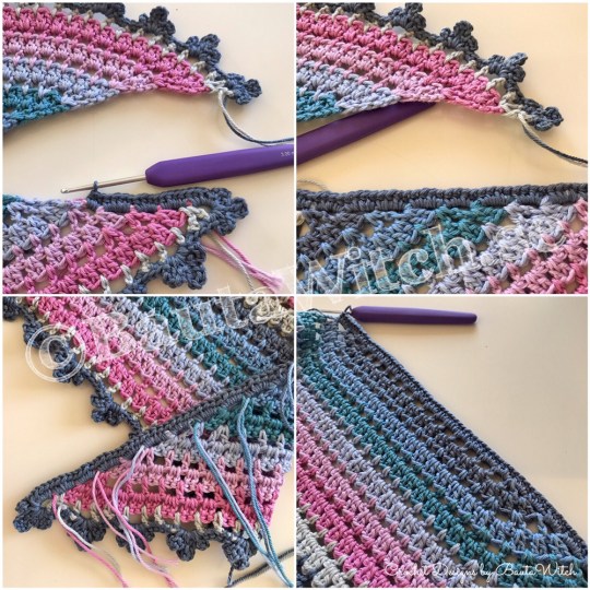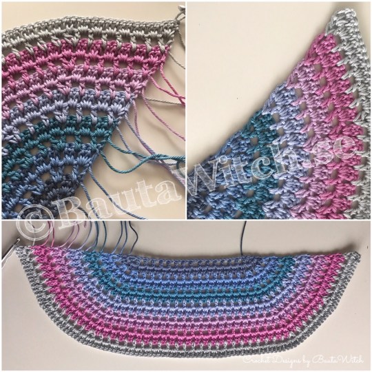 Nu är det dags för randningsparti 2-4. Hädan efter vill vi att sjalen ska växa litet snabbare på bredden så varje varv kommer att börja och sluta med en dst istället för en st. Och alla udda varv kommer börja och sluta med en ökning.