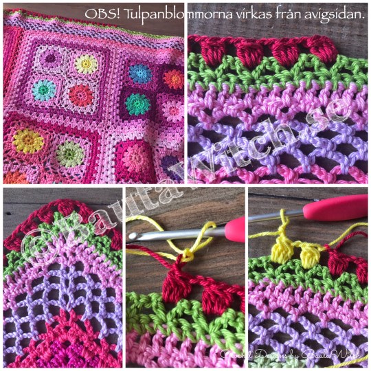 OBS! Fortsättningsvis i mönstret kommer jag inte förklara hur du gör dina ökningar. Där det står ökning innebär det att du virkar 1 lm, 1 st, 1 lm och 1 st i en och samma m mellan 2 stolppar.