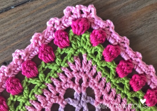 Varv 16: 4 lm (=1 dst), 2 st i varje lmb. Avsluta varvet med ytterligare 1 dst i den sista lmb.