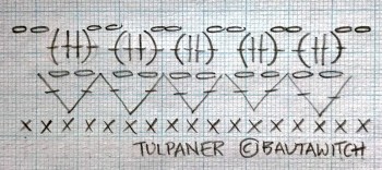 Varv 25: Virkas som v 15 men med 6 ökningar under v enligt följande: mellan stolppar 1 o 2, 28 o 29, 34 o 35 samt motsvarande i slutet av v.