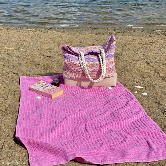Väskan är virkad i Durable Coral och har en juteväska med plastad insida. (Så praktiskt om man har en blöt handduk med sig från stranden eller en kladdig solkrämsflaska! Bara att torka av!)