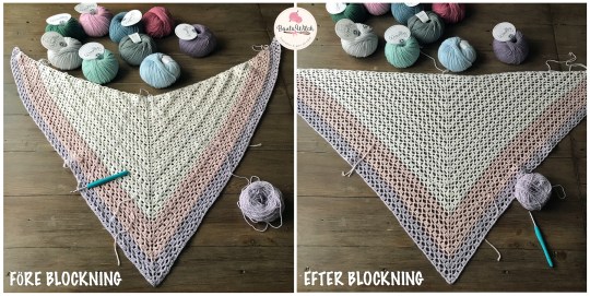 Sjalen blir något större än de båda andra varianterna, trots att antalet varv är det samma som till Romantic Holiday. Det beror på att du virkar med en grövre virknål. Du använder 4,5 mm. Obs! Måtten som anges för sjalen är EFTER blockning.