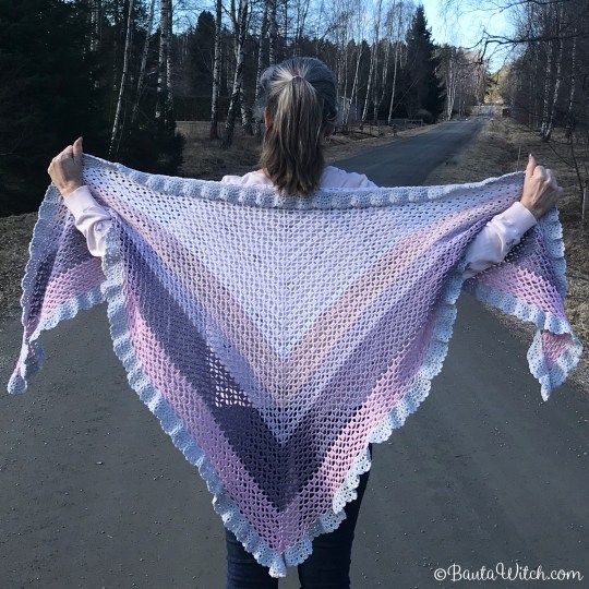 Samma som till sjalen Romantic Holiday men med randning. Sjalen är faktiskt virkad identiskt med modellen Romantic Holiday, med undantag för det näst sista varvet på volangen. Anpassningen är gjord för att volangen inte ska kännas kompakt. Det, tillsammans med en noggrann blockning ger volangen i merinoull, rätt känsla!