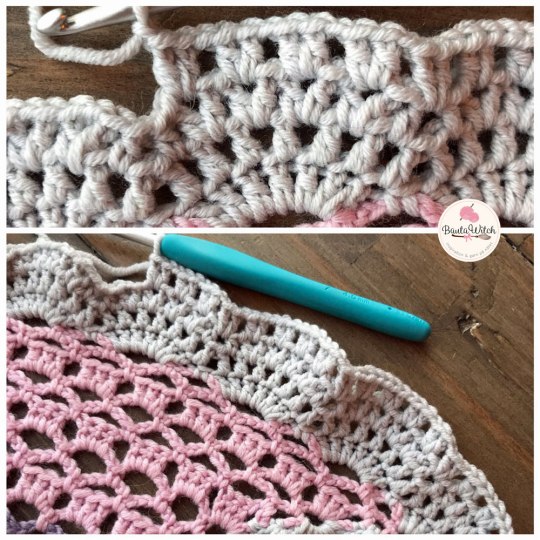 Varv 4: Virkas som varv 4 i mönstret men istället för 3 st i stgr virkas här 2 st. Annars blir volangen för kompakt.